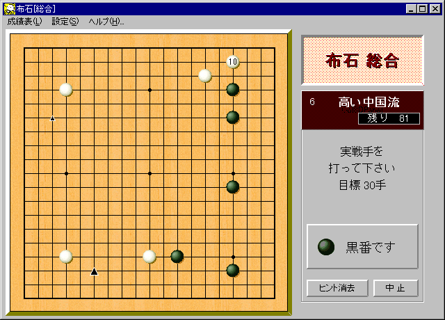 実戦で打たれる布石を手番別に練習します。13種類の布石毎の問題達成率を手番別に持ち、達成度の低い布石・手番を練習することができます。